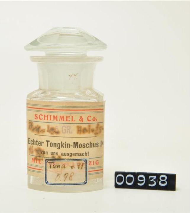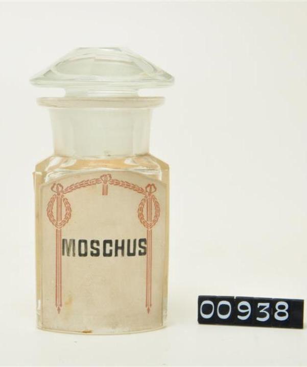 Ovalgriffiges, halb geschliffenes, farbloses Pulverglas. Schulter, Hals, Stopfen und Boden geschliffen und poliert. Eingebranntes, weißes Emailleschild über die gesamte Vorderwand mit jugendstilähnlicher, rotbrauner Randdekoration (Blattgirlande mit Bändern). Schwarz signiert.