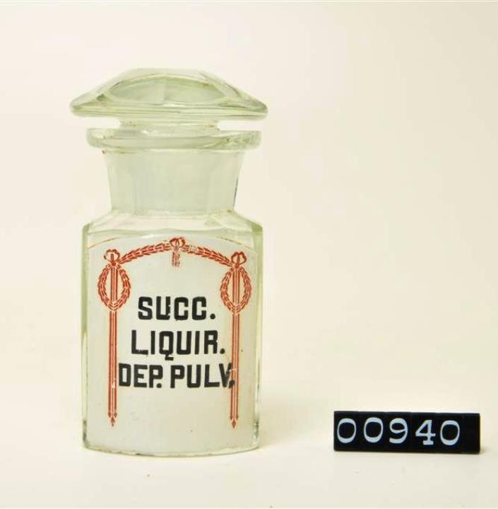 Ovalgriffiges, halb geschliffenes, farbloses Pulverglas. Schulter, Hals, Stopfen und Boden geschliffen und poliert. Eingebranntes, weißes Emailleschild über die gesamte Vorderwand mit jugendstilähnlicher, rotbrauner Randdekoration (Blattgirlande mit Bändern). Signiert.
