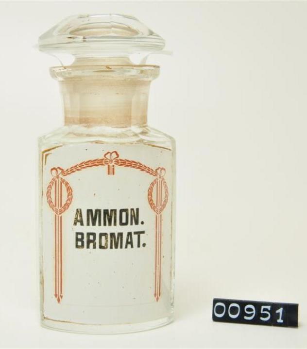 Ovalgriffiges, halb geschliffenes, farbloses Pulverglas. Schulter, Hals, Stopfen und Boden geschliffen und poliert. Eingebranntes, weißes Emailleschild über die gesamte Vorderwand mit jugendstilähnlicher, rotbrauner Randdekoration (Blattgirlande mit Bändern). Schwarz signiert.