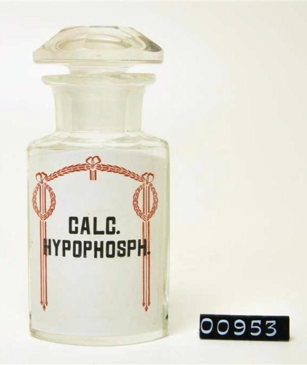 Ovalgriffiges, halb geschliffenes, farbloses Pulverglas. Schulter, Hals, Stopfen und Boden geschliffen und poliert. Eingebranntes, weißes Emailleschild über die gesamte Vorderwand mit jugendstilähnlicher, rotbrauner Randdekoration (Blattgirlande mit Bändern). Schwarz signiert.