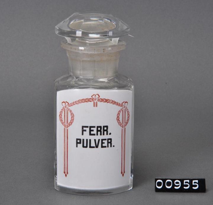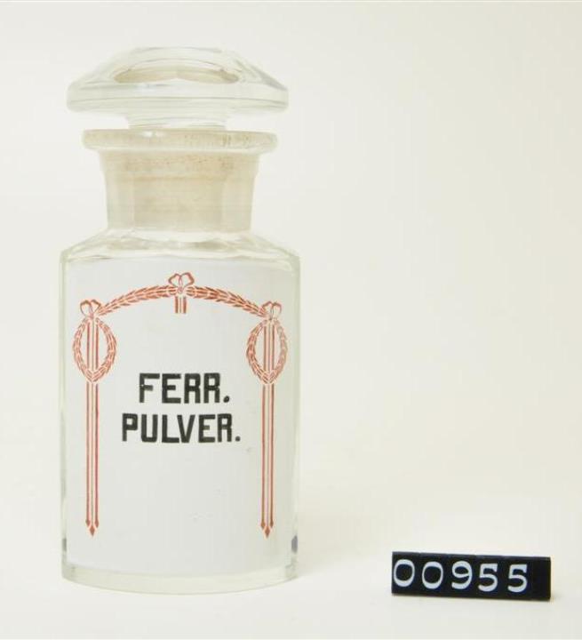 Ovalgriffiges, halb geschliffenes, farbloses Pulverglas. Schulter, Hals, Stopfen und Boden geschliffen und poliert. Eingebranntes, weißes Emailleschild über die gesamte Vorderwand mit jugendstilähnlicher, rotbrauner Randdekoration (Blattgirlande mit Bändern). Schwarz signiert. Enthält Eisenpulver.