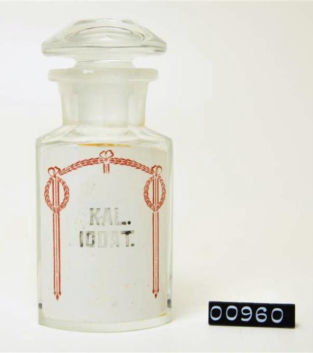 Ovalgriffiges, halb geschliffenes, farbloses Pulverglas. Schulter, Hals, Stopfen und Boden geschliffen und poliert. Eingebranntes, weißes Emailleschild über die gesamte Vorderwand mit jugendstilähnlicher, rotbrauner Randdekoration (Blattgirlande mit Bändern). Schwarz signiert.