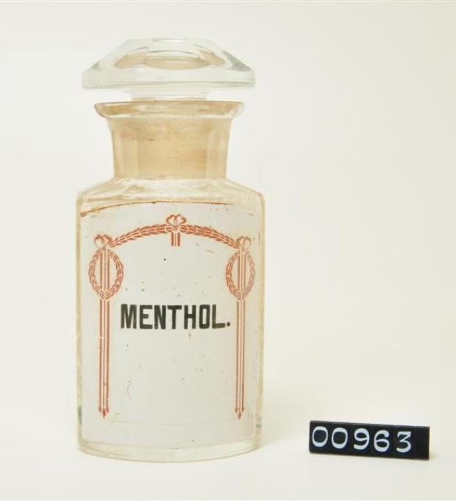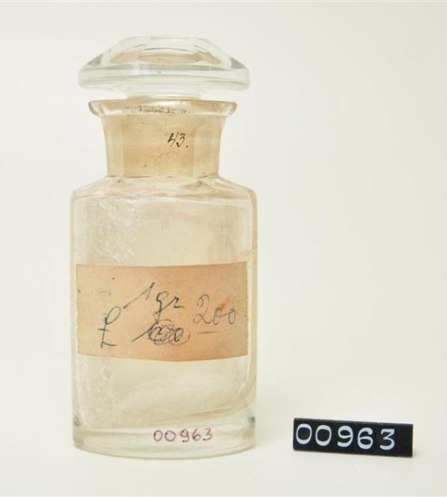 Ovalgriffiges, halb geschliffenes, farbloses Pulverglas. Schulter, Hals, Stopfen und Boden geschliffen und poliert. Eingebranntes, weißes Emailleschild über die gesamte Vorderwand mit jugendstilähnlicher, rotbrauner Randdekoration (Blattgirlande mit Bändern). Schwarz signiert.
