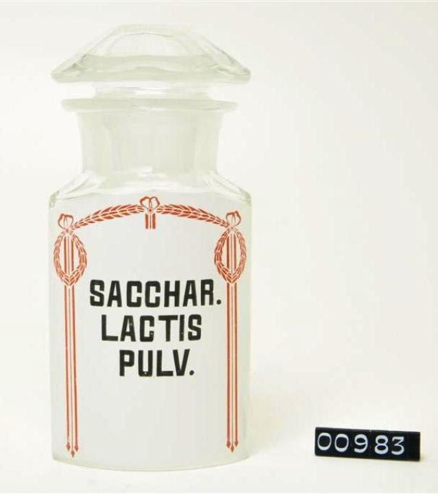 Ovalgriffiges, halb geschliffenes, farbloses Pulverglas. Schliffstopfen mit ringförmigem Hefteisenabriss. Schulter, Hals, Stopfen und Boden geschliffen und poliert. Eingebranntes, weißes Emailleschild über die gesamte Vorderwand mit jugendstilähnlicher, rotbrauner Randdekoration (Blattgirlande mit Bändern). Schwarz signiert.