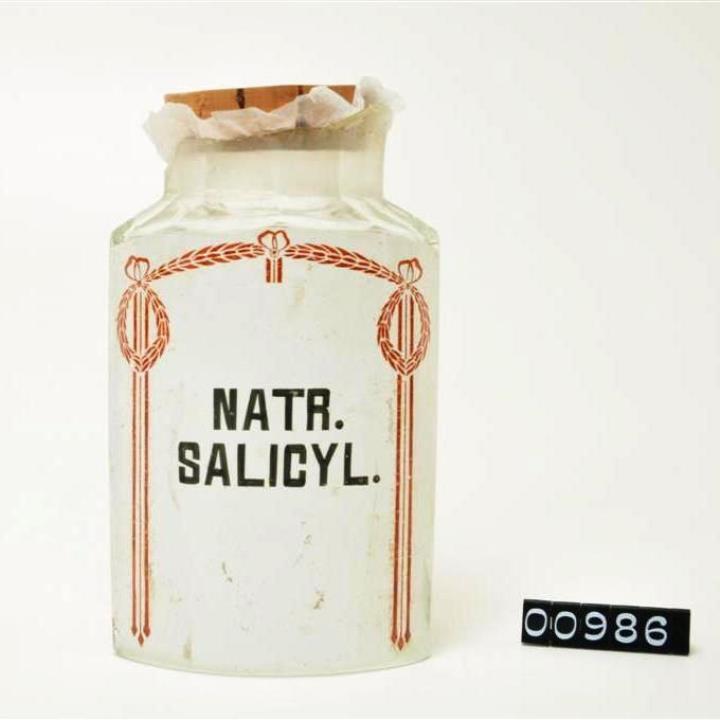 Ovalgriffiges, halb geschliffenes, farbloses Pulverglas. Schulter, Hals und Boden geschliffen und poliert. Eingebranntes, weißes Emailleschild über die gesamte Vorderwand mit jugendstilähnlicher, rotbrauner Randdekoration (Blattgirlande mit Bändern). Schwarz signiert.