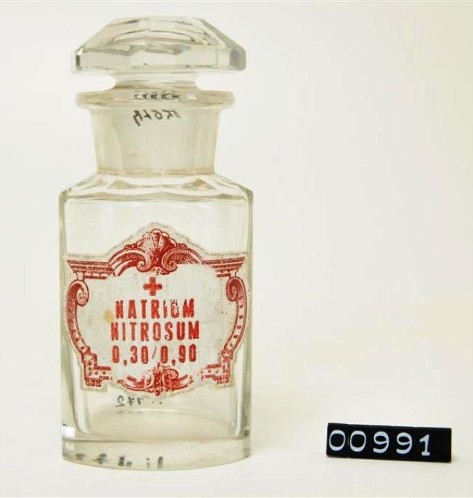 Ovalgriffiges, gepreßtes, farbloses Pulverglas. Schulter, Hals, Stopfen und Boden geschliffen und poliert. Eingebranntes weißes Emailleschild in der Form einer barocken Kartusche mit rotbrauner Schrift und Dekor. Signiert.