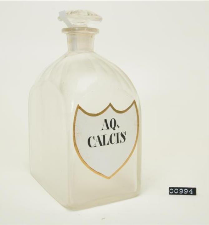 Farblose Vierkantflasche mit Stopfen und nahezu weggeschliffenem Hefteisenabriss. Bis zum Halsansatz überstochen. Unregelmäßig ausgebogener, leicht verdickter Mündungsrand. Schulter, Hals, Stopfen, Seiten, Kanten und Boden geschliffen und poliert. Eingebranntes, weißes Emailleschild in der Form eines Schweizer Schildes mit goldenem Rand. Schwarz signiert.