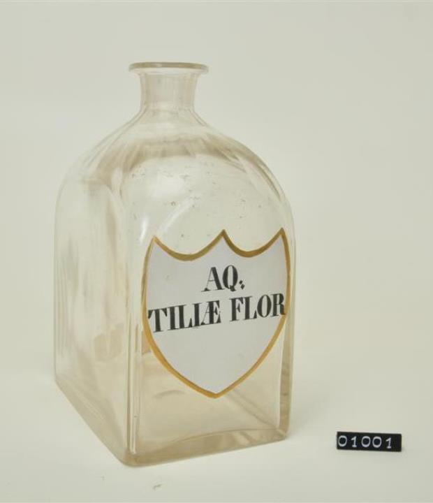 Farblose Vierkantflasche mit Hefteisenabriss, bis zum Halsansatz überstochen. Enghalsflasche. Unregelmäßig ausgebogener, leicht verdickter Mündungsrand. Schulter, Hals, Seiten, Kanten und Boden geschliffen und poliert. Eingebranntes, weißes Emailleschild in der Form eines Schweizer Schildes mit goldenem Rand. Schwarz signiert.