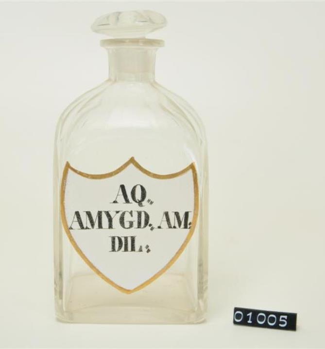 Farblose Vierkantflasche mit Stopfen, Enghalsflasche, Hefteisenabriss weggeschliffen. Bis zum Halsansatz überstochen. Unregelmäßig ausgebogener, leicht verdickter Mündungsrand. Schulter, Hals, Stopfen, Seiten, Kanten und Boden geschliffen und poliert. Eingebranntes, weißes Emailleschild in der Form eines Schweizer Schildes mit goldenem Rand. Schwarz signiert.