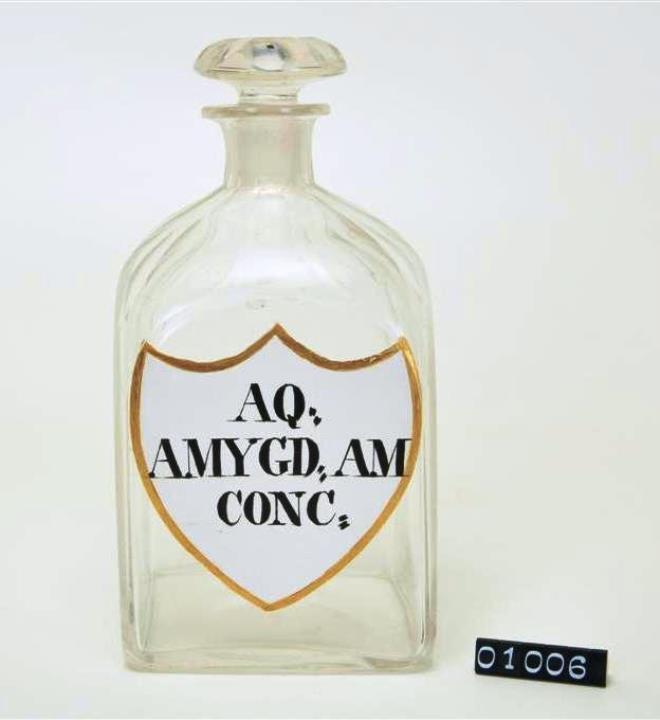 Farblose Vierkantflasche mit Stopfen, Enghalsflasche, Hefteisenabriss teilweise weggeschliffen. Bis zum Halsansatz überstochen. Unregelmäßig ausgebogener, leicht verdickter Mündungsrand. Schulter, Hals, Stopfen, Seiten, Kanten und Boden geschliffen und poliert. Eingebranntes, weißes Emailleschild in der Form eines Schweizer Schildes mit goldenem Rand. Schwarz signiert.