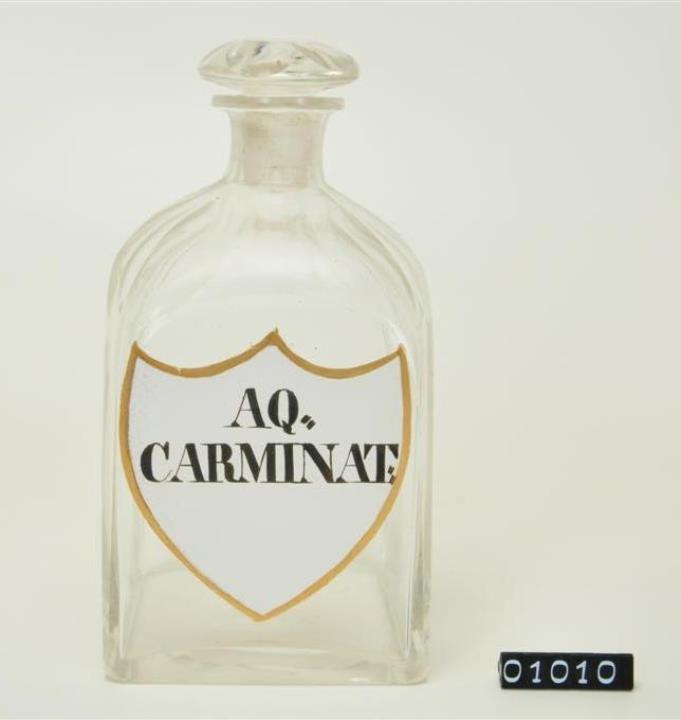 Farblose Vierkantflasche mit Stopfen, Enghalsflasche, Hefteisenabriss teilweise weggeschliffen. Bis zum Halsansatz überstochen. Unregelmäßig ausgebogener, leicht verdickter Mündungsrand. Schulter, Hals, Stopfen, Seiten, Kanten und Boden geschliffen und poliert. Eingebranntes, weißes Emailleschild in der Form eines Schweizer Schildes mit goldenem Rand. Schwarz signiert.