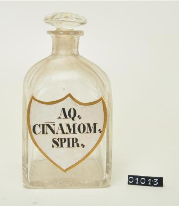 Farblose Vierkantflasche mit Stopfen, Enghalsflasche, Hefteisenabriss teilweise weggeschliffen. Bis zum Halsansatz überstochen. Unregelmäßig ausgebogener, leicht verdickter Mündungsrand. Schulter, Hals, Stopfen, Seiten, Kanten und Boden geschliffen und poliert. Eingebranntes, weißes Emailleschild in der Form eines Schweizer Schildes mit goldenem Rand. Schwarz signiert.