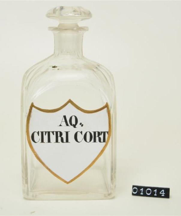 Farblose Vierkantflasche mit Stopfen, Enghalsflasche, Hefteisenabriss teilweise weggeschliffen. Bis zum Halsansatz überstochen. Unregelmäßig ausgebogener, leicht verdickter Mündungsrand. Schulter, Hals, Stopfen, Seiten, Kanten und Boden geschliffen und poliert. Eingebranntes, weißes Emailleschild in der Form eines Schweizer Schildes mit goldenem Rand. Schwarz signiert.