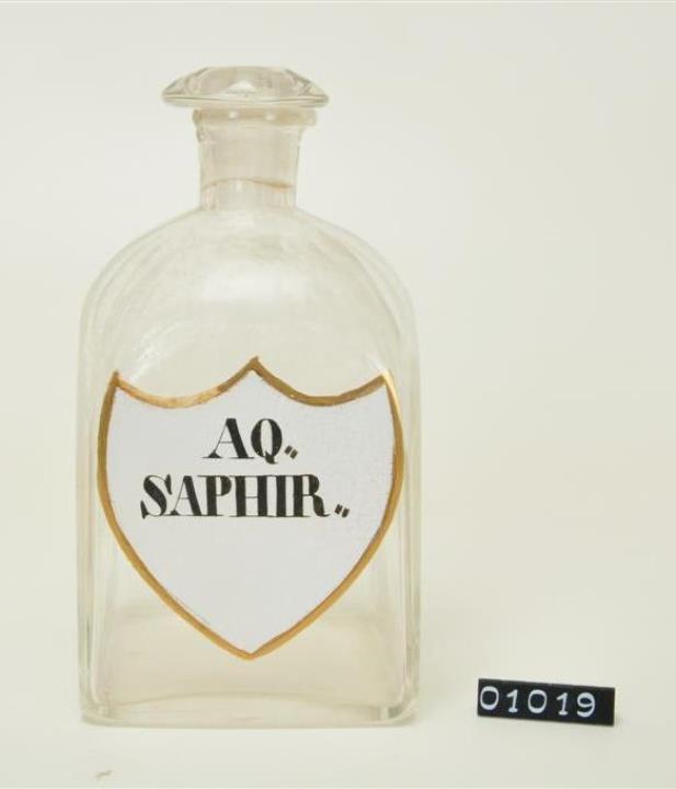 Farblose Vierkantflasche mit Stopfen, Enghalsflasche, Hefteisenabriss teilweise weggeschliffen. Bis zum Halsansatz überstochen. Unregelmäßig ausgebogener, leicht verdickter Mündungsrand. Schulter, Hals, Stopfen, Seiten, Kanten und Boden geschliffen und poliert. Eingebranntes, weißes Emailleschild in der Form eines Schweizer Schildes mit goldenem Rand. Schwarz signiert.