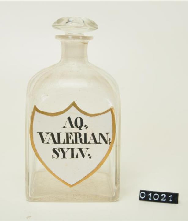 Farblose Vierkantflasche mit Stopfen, Enghalsflasche, Hefteisenabriss teilweise weggeschliffen. Bis zum Halsansatz überstochen. Unregelmäßig ausgebogener, leicht verdickter Mündungsrand. Schulter, Hals, Stopfen, Seiten, Kanten und Boden geschliffen und poliert. Eingebranntes, weißes Emailleschild in der Form eines Schweizer Schildes mit goldenem Rand. Schwarz signiert.