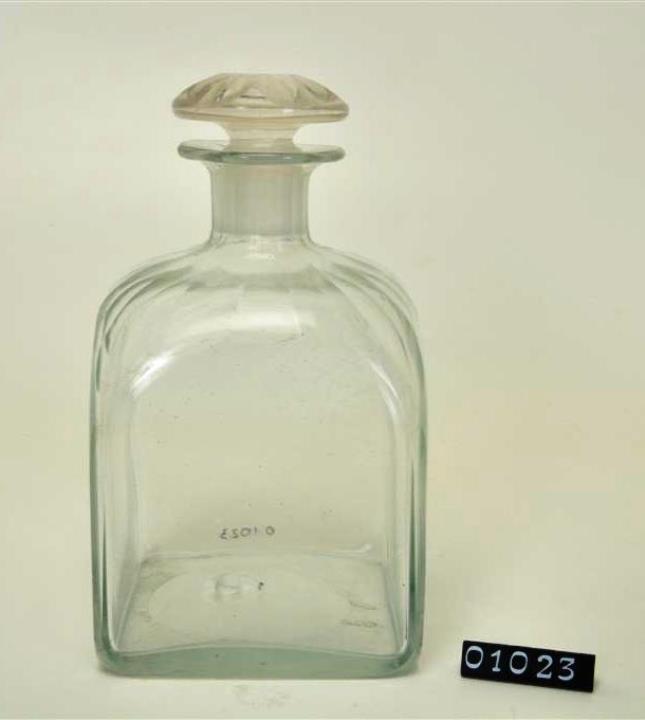 Farblose Vierkantflasche mit Stopfen, Enghalsflasche, Hefteisenabriss teilweise weggeschliffen. Bis zum Halsansatz überstochen. Unregelmäßig ausgebogener, leicht verdickter Mündungsrand. Schulter, Hals, Stopfen, Seiten, Kanten und Boden geschliffen und poliert. Nicht signiert.