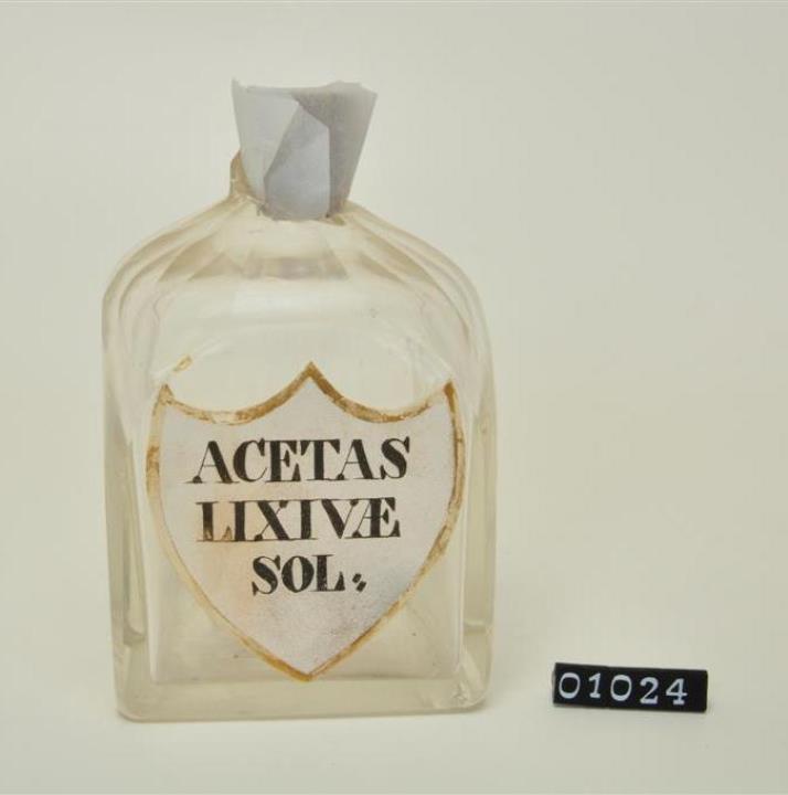 Farblose Vierkantflasche mit Stopfen, Enghalsflasche, Hefteisenabriss teilweise weggeschliffen. Bis zum Halsansatz überstochen. Unregelmäßig ausgebogener, leicht verdickter Mündungsrand. Schulter, Hals, Stopfen, Seiten, Kanten und Boden geschliffen und poliert. Eingebranntes, weißes Emailleschild in der Form eines Schweizer Schildes mit goldenem Rand. Schwarz signiert.