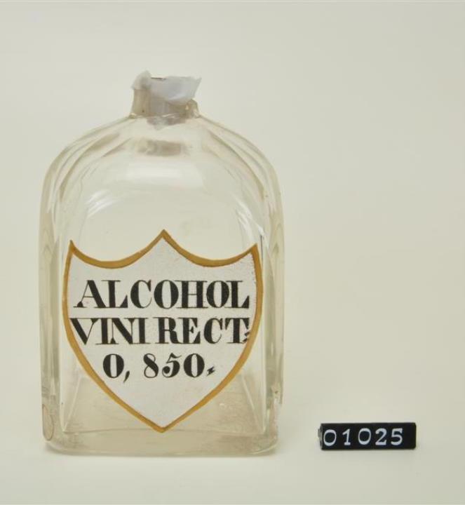 Farblose Vierkantflasche mit Stopfen, Enghalsflasche, Hefteisenabriss teilweise weggeschliffen. Bis zum Halsansatz überstochen. Unregelmäßig ausgebogener, leicht verdickter Mündungsrand. Schulter, Hals, Stopfen, Seiten, Kanten und Boden geschliffen und poliert. Eingebranntes, weißes Emailleschild in der Form eines Schweizer Schildes mit goldenem Rand. Schwarz signiert.