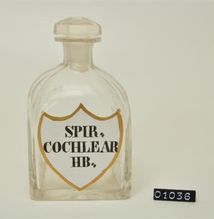 Farblose Vierkantflasche mit Stopfen, Enghalsflasche, Hefteisenabriss teilweise weggeschliffen. Bis zum Halsansatz überstochen. Unregelmäßig ausgebogener, leicht verdickter Mündungsrand. Schulter, Hals, Stopfen, Seiten, Kanten und Boden geschliffen und poliert. Eingebranntes, weißes Emailleschild in der Form eines Schweizer Schildes mit goldenem Rand. Schwarz signiert.