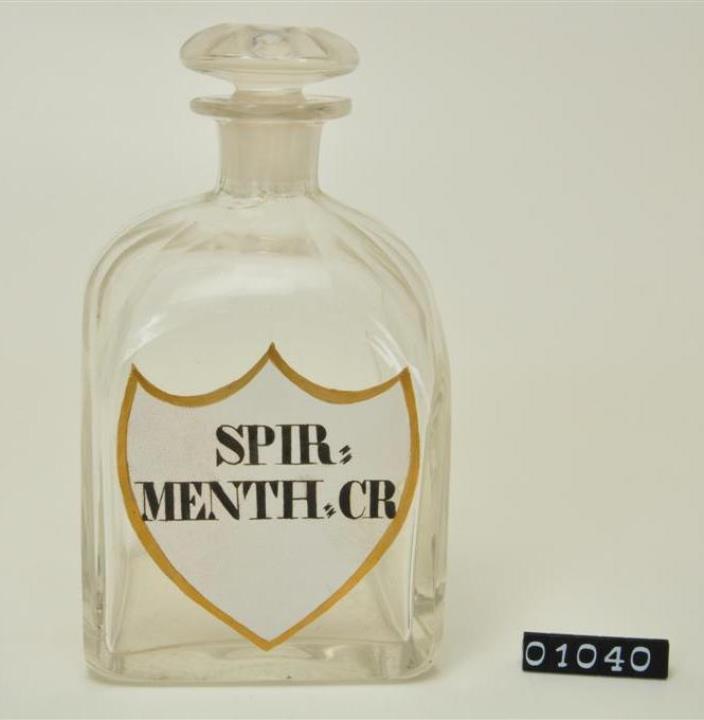 Farblose Vierkantflasche mit Stopfen, Enghalsflasche, Hefteisenabriss teilweise weggeschliffen. Bis zum Halsansatz überstochen. Unregelmäßig ausgebogener, leicht verdickter Mündungsrand. Schulter, Hals, Stopfen, Seiten, Kanten und Boden geschliffen und poliert. Eingebranntes, weißes Emailleschild in der Form eines Schweizer Schildes mit goldenem Rand. Schwarz signiert.