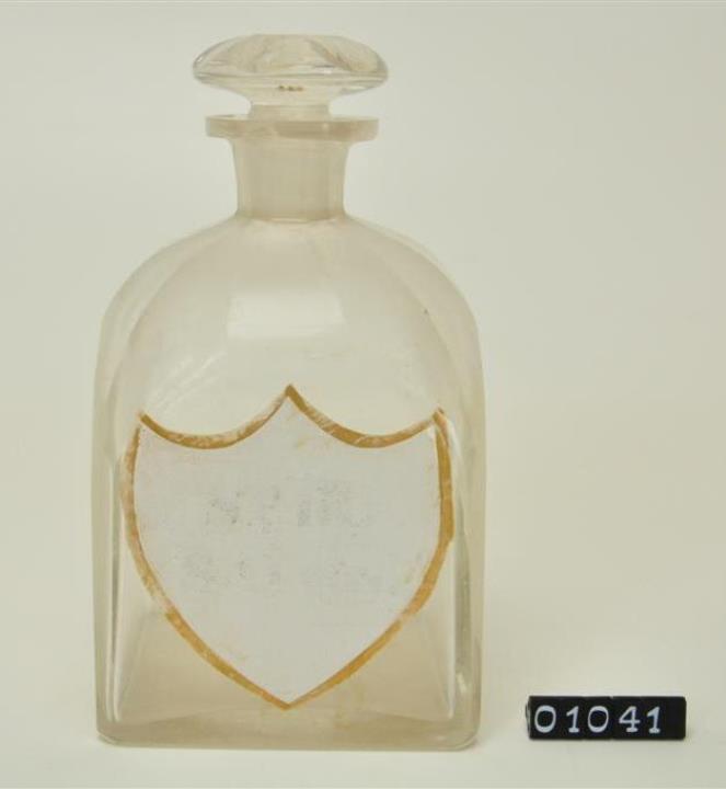 Farblose Vierkantflasche mit Stopfen, Enghalsflasche, Hefteisenabriss teilweise weggeschliffen. Bis zum Halsansatz überstochen. Unregelmäßig ausgebogener, leicht verdickter Mündungsrand. Schulter, Hals, Stopfen, Seiten, Kanten und Boden geschliffen und poliert. Eingebranntes, weißes Emailleschild in der Form eines Schweizer Schildes mit goldenem Rand. Schwarz signiert.