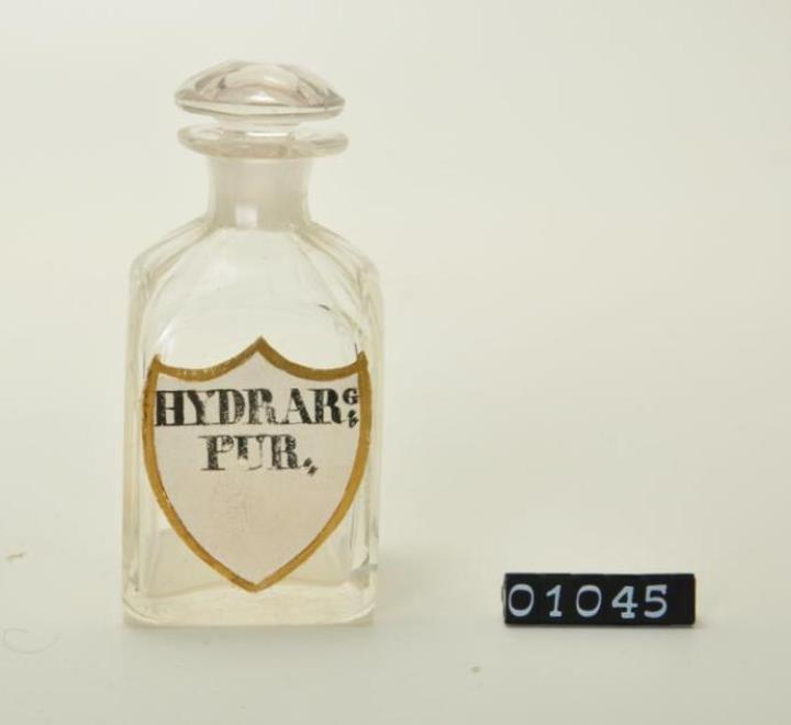 Farblose Vierkantflasche mit Stopfen, Hefteisenabriss teilweise weggeschliffen. Bis zum Halsansatz überstochen. Unregelmäßig ausgebogener, leicht verdickter Mündungsrand. Schulter, Hals, Stopfen, Seiten, Kanten und Boden geschliffen und poliert. Eingebranntes, weißes Emailleschild in der Form eines Schweizer Schildes mit goldenem Rand. Schwarz signiert.