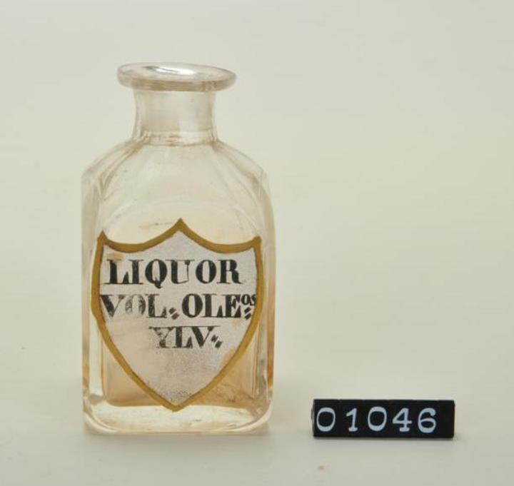 Farblose Vierkantflasche mit Stopfen, Hefteisenabriss teilweise weggeschliffen. Bis zum Halsansatz überstochen. Unregelmäßig ausgebogener, leicht verdickter Mündungsrand. Schulter, Hals, Seiten, Kanten und Boden geschliffen und poliert. Eingebranntes, weißes Emailleschild in der Form eines Schweizer Schildes mit goldenem Rand. Schwarz signiert.