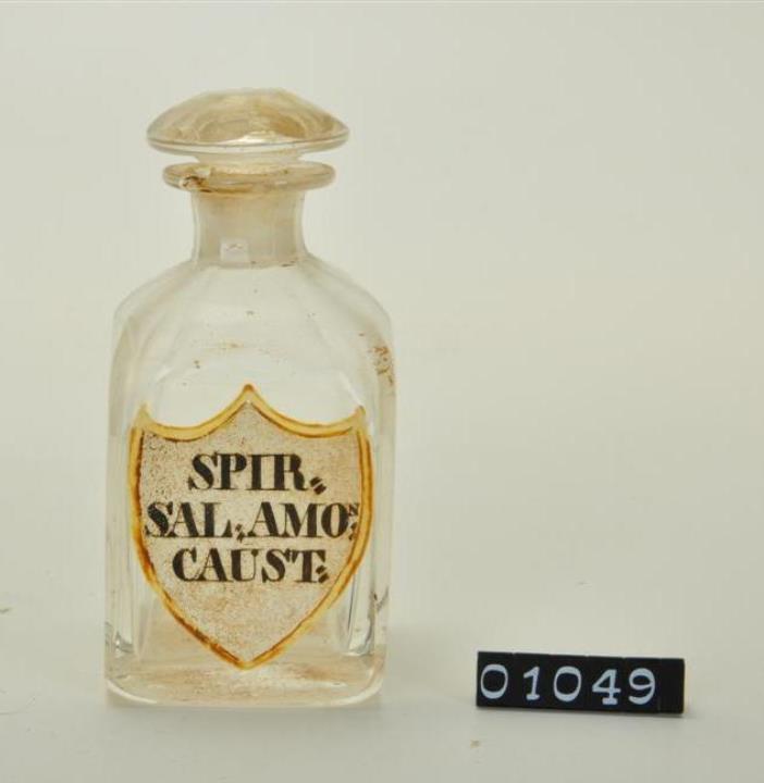 Farblose Vierkantflasche mit Stopfen, Hefteisenabriss teilweise weggeschliffen. Bis zum Halsansatz überstochen. Unregelmäßig ausgebogener, leicht verdickter Mündungsrand. Schulter, Hals, Stopfen, Seiten, Kanten und Boden geschliffen und poliert. Eingebranntes, weißes Emailleschild in der Form eines Schweizer Schildes mit goldenem Rand. Schwarz signiert.