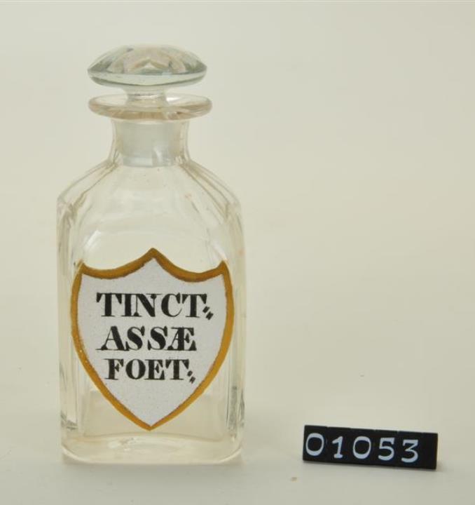 Farblose Vierkantflasche mit Stopfen, Hefteisenabriss teilweise weggeschliffen. Bis zum Halsansatz überstochen. Unregelmäßig ausgebogener, leicht verdickter Mündungsrand. Schulter, Hals, Stopfen, Seiten, Kanten und Boden geschliffen und poliert. Eingebranntes, weißes Emailleschild in der Form eines Schweizer Schildes mit goldenem Rand. Schwarz signiert.