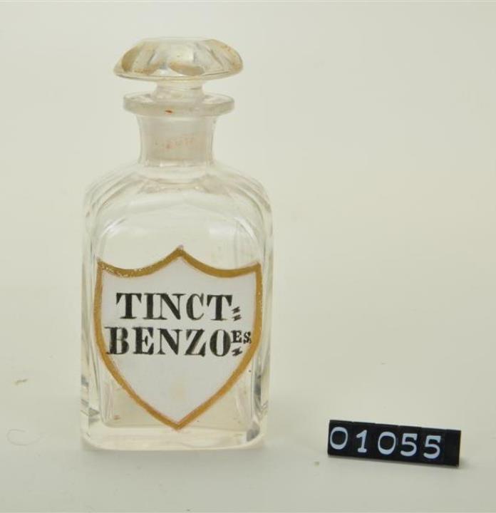 Farblose Vierkantflasche mit Stopfen, Hefteisenabriss teilweise weggeschliffen. Bis zum Halsansatz überstochen. Unregelmäßig ausgebogener, leicht verdickter Mündungsrand. Schulter, Hals, Stopfen, Seiten, Kanten und Boden geschliffen und poliert. Eingebranntes, weißes Emailleschild in der Form eines Schweizer Schildes mit goldenem Rand. Schwarz signiert.
