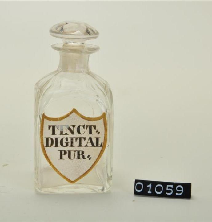 Farblose Vierkantflasche mit Stopfen, Hefteisenabriss teilweise weggeschliffen. Bis zum Halsansatz überstochen. Unregelmäßig ausgebogener, leicht verdickter Mündungsrand. Schulter, Hals, Stopfen, Seiten, Kanten und Boden geschliffen und poliert. Eingebranntes, weißes Emailleschild in der Form eines Schweizer Schildes mit goldenem Rand. Schwarz signiert.