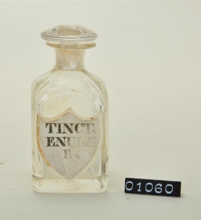 Farblose Vierkantflasche mit Stopfen, Hefteisenabriss teilweise weggeschliffen. Bis zum Halsansatz überstochen. Unregelmäßig ausgebogener, leicht verdickter Mündungsrand. Schulter, Hals, Stopfen, Seiten, Kanten und Boden geschliffen und poliert. Eingebranntes, weißes Emailleschild in der Form eines Schweizer Schildes mit goldenem Rand. Schwarz signiert.
