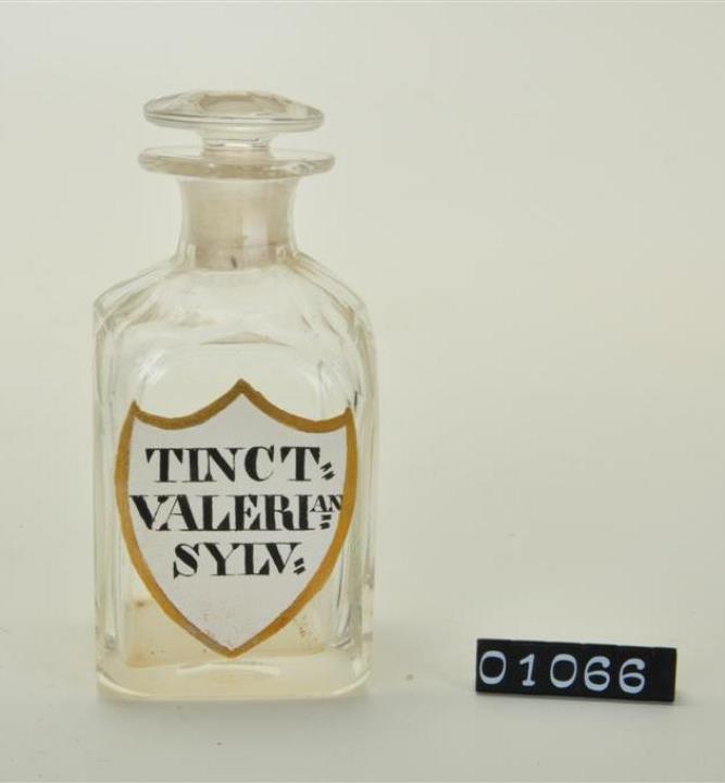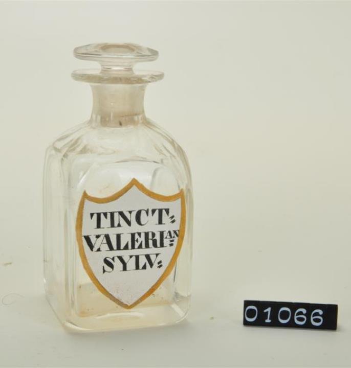 Farblose Vierkantflasche mit Stopfen, Hefteisenabriss teilweise weggeschliffen. Bis zum Halsansatz überstochen. Unregelmäßig ausgebogener, leicht verdickter Mündungsrand. Schulter, Hals, Stopfen, Seiten, Kanten und Boden geschliffen und poliert. Eingebranntes, weißes Emailleschild in der Form eines Schweizer Schildes mit goldenem Rand. Schwarz signiert.