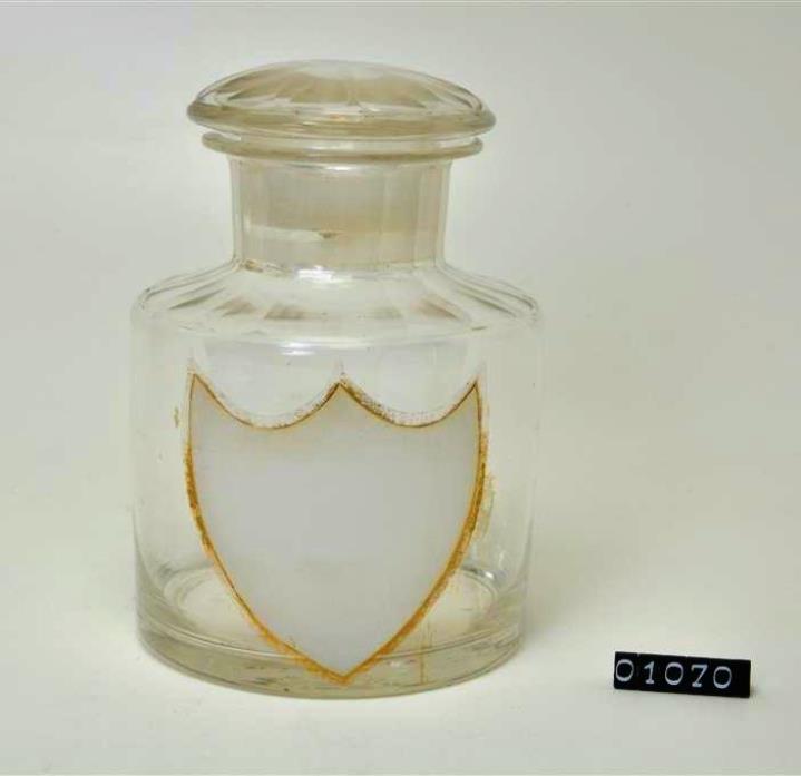 Rundes, farbloses Pulverglas mit Hohlstopfen. Hefteisenabriss am Boden teilweise weggeschliffen, am Stopfen belassen. Bis zum Halsansatz überstochen. Unregelmäßig ausgebogener, leicht verdickter Mündungsrand. Schulter, Hals, Stopfen und Boden geschliffen und poliert. Eingebranntes, weißes Emailleschild in der Form eines Schweizer Schildes mit goldenem Rand. Nicht signiert.