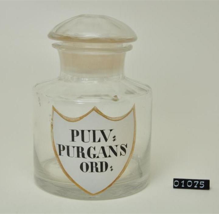 Rundes, farbloses Pulverglas mit Hohlstopfen. Hefteisenabriss am Boden teilweise weggeschliffen, am Stopfen belassen. Bis zum Halsansatz überstochen. Unregelmäßig ausgebogener, leicht verdickter Mündungsrand. Schulter, Hals, Stopfen und Boden geschliffen und poliert. Eingebranntes, weißes Emailleschild in der Form eines Schweizer Schildes mit goldenem Rand. Schwarz signiert