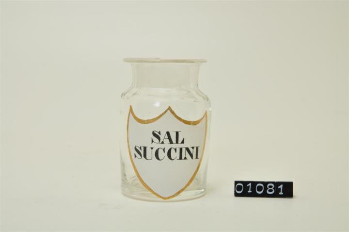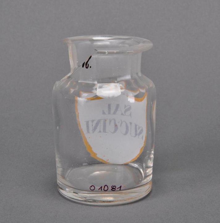 Rundes, farbloses Pulverglas ohne Stopfen, Hefteisenabriss teilweise weggeschliffen. Bis zum Halsansatz überstochen. Unregelmäßig ausgebogener, leicht verdickter Mündungsrand. Schulter, Hals und Boden geschliffen und poliert. Hals und Schulter teilweise weggebrochen, Sprung in der Wand. Eingebranntes, weißes Emailleschild in der Form eines Schweizer Schildes mit goldenem Rand. Schwarz signiert.