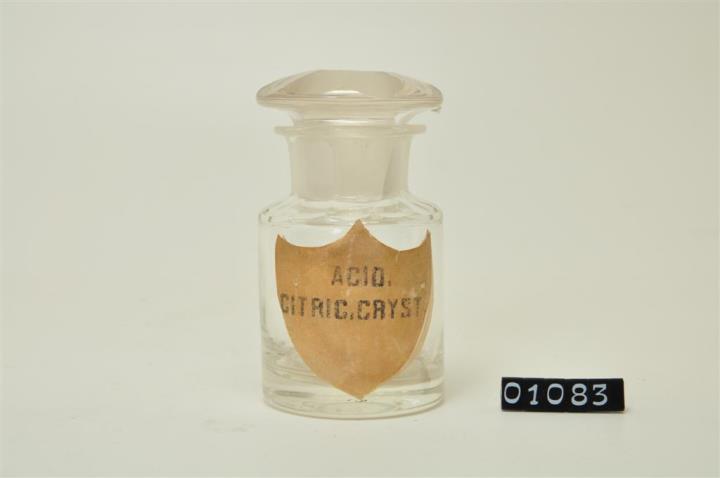 Rundes, farbloses Pulverglas mit Stopfen, Hefteisenabriss teilweise weggeschliffen. Bis zum Halsansatz überstochen. Unregelmäßig ausgebogener, leicht verdickter Mündungsrand. Schulter, Hals, Stopfen und Boden geschliffen und poliert. Eingebranntes, weißes Emailleschild in der Form eines Schweizer Schildes mit goldenem Rand und mit ockerfarbigem Papierschild überklebt. Schwarz signiert.