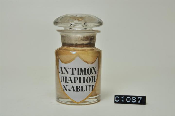 Rundes, farbloses Pulverglas mit Stopfen, Hefteisenabriss teilweise weggeschliffen, am Massivstopfen belassen. Bis zum Halsansatz überstochen. Unregelmäßig ausgebogener, leicht verdickter Mündungsrand. Schulter, Hals, Stopfen und Boden geschliffen und poliert. Eingebranntes, weißes Emailleschild in der Form eines Schweizer Schildes mit goldenem Rand. Schwarz signiert.