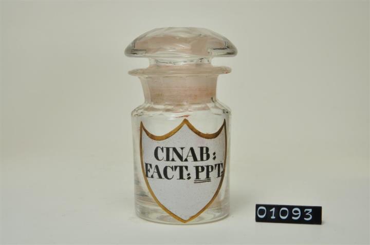 Rundes, farbloses Pulverglas mit Stopfen, Hefteisenabriss teilweise weggeschliffen, am Massivstopfen belassen. Bis zum Halsansatz überstochen. Unregelmäßig ausgebogener, leicht verdickter Mündungsrand. Schulter, Hals, Stopfen und Boden geschliffen und poliert. Eingebranntes, weißes Emailleschild in der Form eines Schweizer Schildes mit goldenem Rand. Schwarz signiert.
