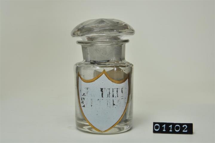 Rundes, farbloses Pulverglas mit Stopfen, Hefteisenabriss teilweise weggeschliffen, am Hohlstopfen belassen. Bis zum Halsansatz überstochen. Unregelmäßig ausgebogener, leicht verdickter Mündungsrand. Schulter, Hals und Stopfen geschliffen und poliert. Eingebranntes, weißes Emailleschild in der Form eines Schweizer Schildes mit goldenem Rand. Schwarz signiert, Schrift teilweise abgegangen.