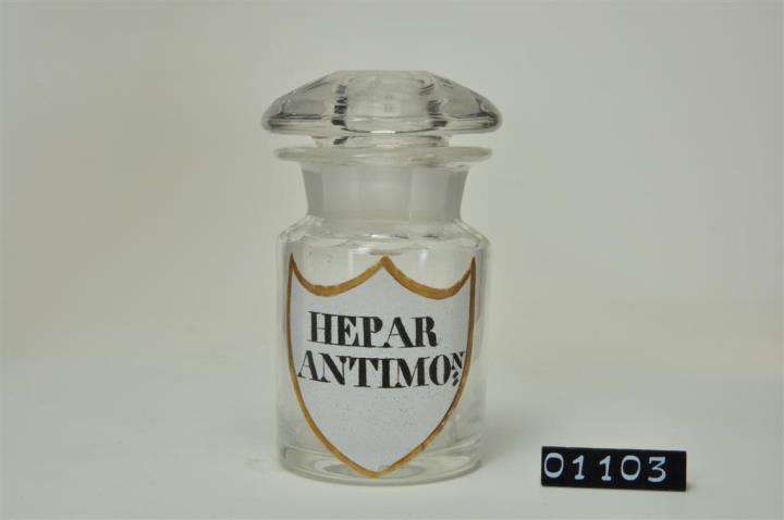Rundes, farbloses Pulverglas mit Stopfen, Hefteisenabriss teilweise weggeschliffen, am Massivstopfen belassen. Bis zum Halsansatz überstochen. Unregelmäßig ausgebogener, leicht verdickter Mündungsrand. Schulter, Hals, Stopfen und Boden geschliffen und poliert. Eingebranntes, weißes Emailleschild in der Form eines Schweizer Schildes mit goldenem Rand. Schwarz signiert.