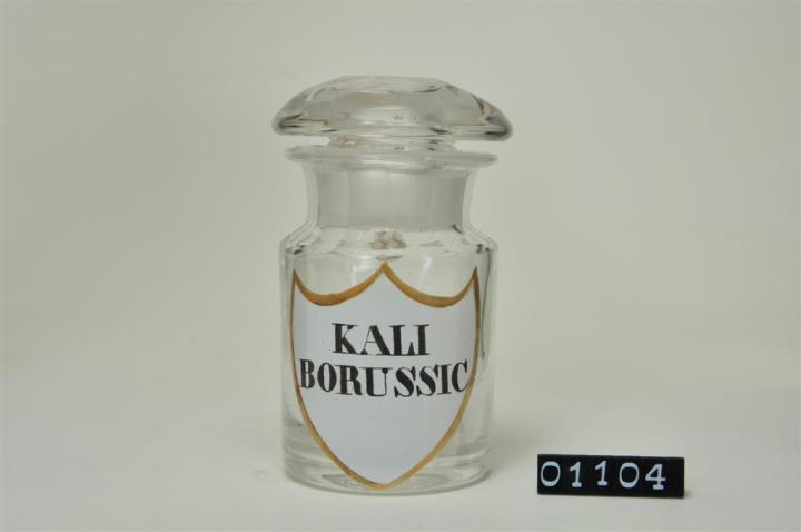 Rundes, farbloses Pulverglas mit Stopfen, Hefteisenabriss teilweise weggeschliffen, am Massivstopfen belassen. Bis zum Halsansatz überstochen. Unregelmäßig ausgebogener, leicht verdickter Mündungsrand. Schulter, Hals, Stopfen und Boden geschliffen und poliert. Eingebranntes, weißes Emailleschild in der Form eines Schweizer Schildes mit goldenem Rand. Schwarz signiert.