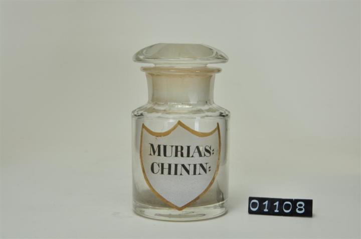 Rundes, farbloses Pulverglas mit Massivstopfen, Hefteisenabriss teilweise weggeschliffen. Bis zum Halsansatz überstochen. Unregelmäßig ausgebogener, leicht verdickter Mündungsrand. Schulter, Hals, Stopfen und Boden geschliffen und poliert. Eingebranntes, weißes Emailleschild in der Form eines Schweizer Schildes mit goldenem Rand. Schwarz signiert.