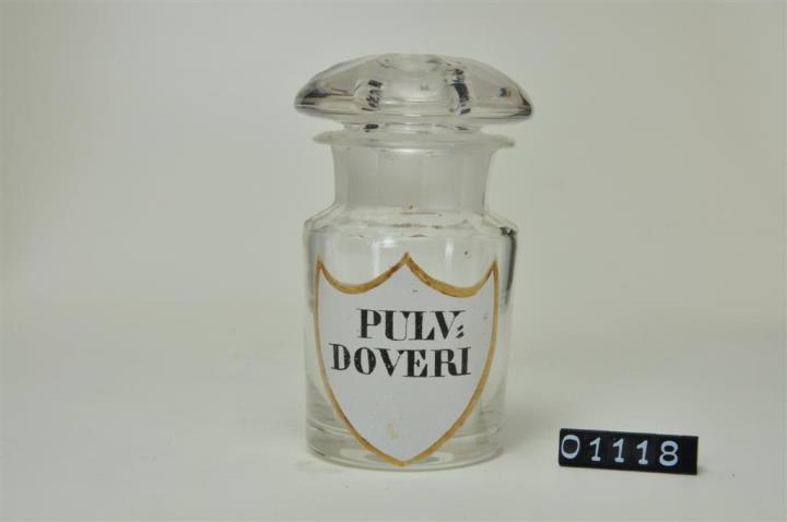 Rundes, farbloses Pulverglas mit Stopfen, Hefteisenabriss teilweise weggeschliffen, am Hohlstopfen belassen. Bis zum Halsansatz überstochen. Unregelmäßig ausgebogener, leicht verdickter Mündungsrand. Schulter, Hals, Stopfen und Boden geschliffen und poliert. Eingebranntes, weißes Emailleschild in der Form eines Schweizer Schildes mit goldenem Rand. Schwarz signiert.