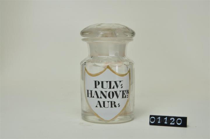 Rundes, farbloses Pulverglas mit Stopfen, Hefteisenabriss teilweise weggeschliffen, am Hohlstopfen belassen. Bis zum Halsansatz überstochen. Unregelmäßig ausgebogener, leicht verdickter Mündungsrand. Schulter, Hals, Stopfen und Boden geschliffen und poliert. Eingebranntes, weißes Emailleschild in der Form eines Schweizer Schildes mit goldenem Rand. Schwarz signiert.