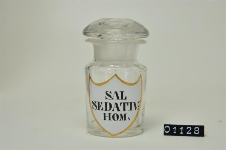 Rundes, farbloses Pulverglas mit Stopfen, Hefteisenabriss teilweise weggeschliffen, am Hohlstopfen belassen. Bis zum Halsansatz überstochen. Unregelmäßig ausgebogener, leicht verdickter Mündungsrand. Schulter, Hals, Stopfen und Boden geschliffen und poliert. Eingebranntes, weißes Emailleschild in der Form eines Schweizer Schildes mit goldenem Rand. Schwarz signiert.