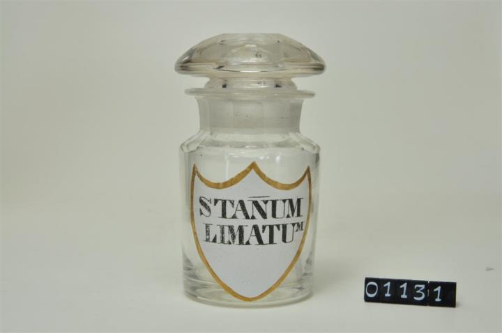 Rundes, farbloses Pulverglas mit Stopfen, Hefteisenabriss teilweise weggeschliffen, am Hohlstopfen belassen. Bis zum Halsansatz überstochen. Unregelmäßig ausgebogener, leicht verdickter Mündungsrand. Schulter, Hals, Stopfen und Boden geschliffen und poliert. Eingebranntes, weißes Emailleschild in der Form eines Schweizer Schildes mit goldenem Rand. Schwarz signiert.