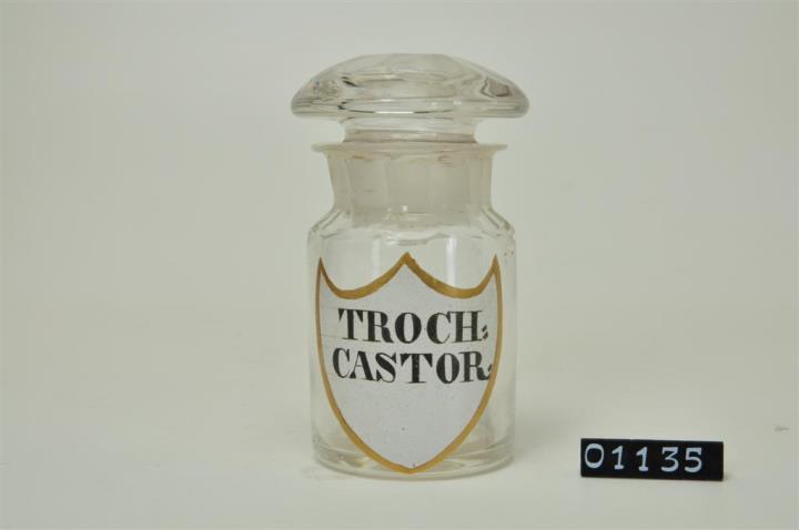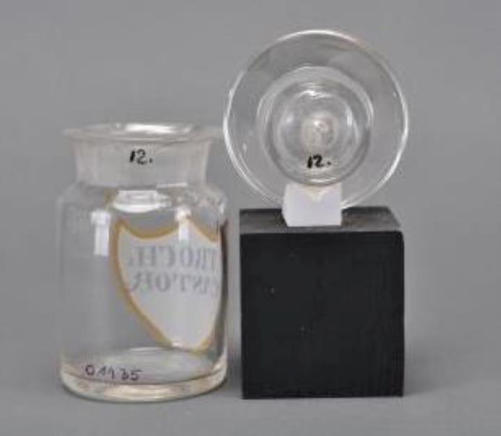 Rundes, farbloses Pulverglas mit Stopfen, Hefteisenabriss teilweise weggeschliffen, am Hohlstopfen belassen. Bis zum Halsansatz überstochen. Unregelmäßig ausgebogener, leicht verdickter Mündungsrand. Schulter, Hals, Stopfen und Boden geschliffen und poliert. Eingebranntes, weißes Emailleschild in der Form eines Schweizer Schildes mit goldenem Rand. Schwarz signiert.