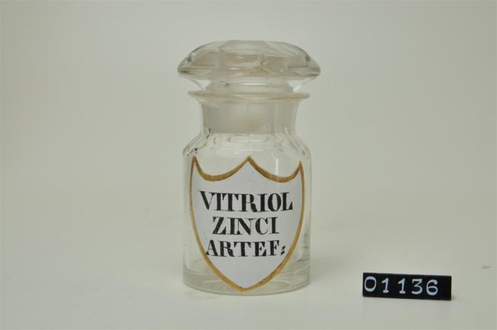 Rundes, farbloses Pulverglas mit Stopfen, Hefteisenabriss teilweise weggeschliffen, am Hohlstopfen belassen. Bis zum Halsansatz überstochen. Unregelmäßig ausgebogener, leicht verdickter Mündungsrand. Schulter, Hals, Stopfen und Boden geschliffen und poliert. Eingebranntes, weißes Emailleschild in der Form eines Schweizer Schildes mit goldenem Rand. Schwarz signiert.
