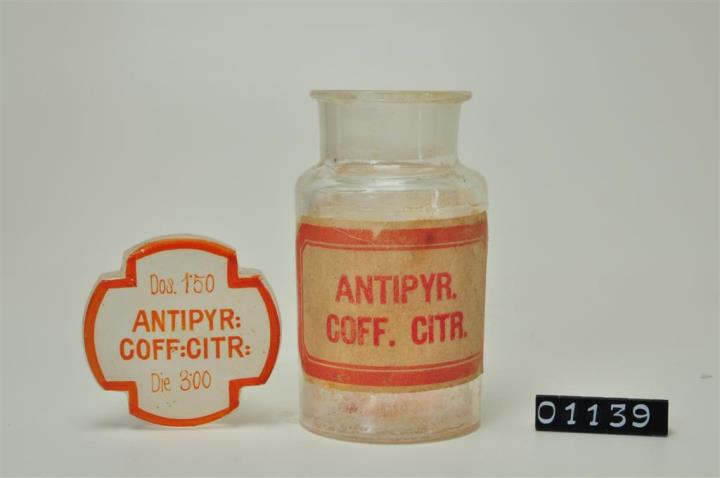 Rundes, farbloses Pulverglas mit signiertem, emailliertem Kreuzstopfen (Massivstopfen). Ausgebogener, abgeflachter Mündungsrand. Achteckiges Papierschild mit rotem Doppelrand. Rot signiert.